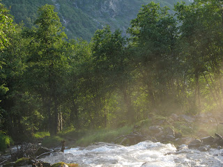 Then he finally appeared. We reached some water. Oh no, not some water, we actually found ourselves on top of the unleashed fierce waterfall. And the rays of the midnight sun penetrated the greenery now, framing our already fantastic view with tangible gold-diamond rays. Oh, good that I followed him... We were now in the middle of a guilded picture with translucent lights and cold watersteam and lush greenery...