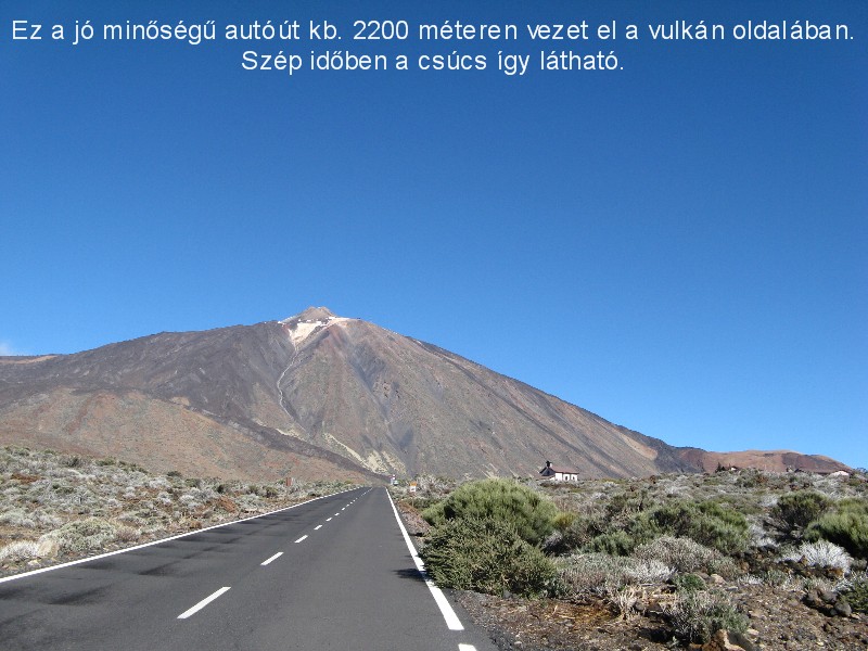 Háromezerötszáz méterig lehet feljutni, ugyanis kétezerháromszázról teleferik visz fel. Jó időben. Első napon, mikor ide kirándultunk, ahelyett, hogy Playa de las Americas finom homokos partjain süttettük volna a hasunkat (ha ugyan ott is nem zuhogott), nem volt jó idő. Sebaj, azért nagyon jó kis kirándulás volt, lenyűgözve kanyarogtunk le kétezer méternyi szintkülönbséget szűk hegyi utakon. Los Cristianos – Abona – Vilaflor – Boca de Tauce – nemzeti park útvonalon mentünk fel, és az El Portillo – Aguamansa – Orotava – Santa Ursula útvonalon jöttünk le. De mindkét esetben 2356 méterről tengerszintig (vagy fordítva) tartó szintkülönbséget kellett megtenni.