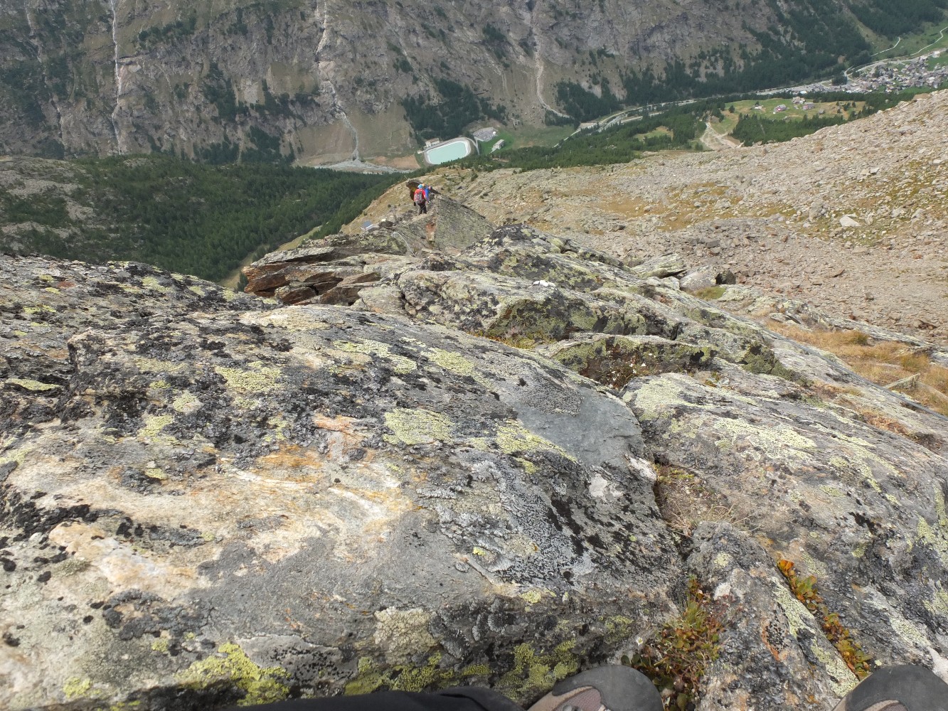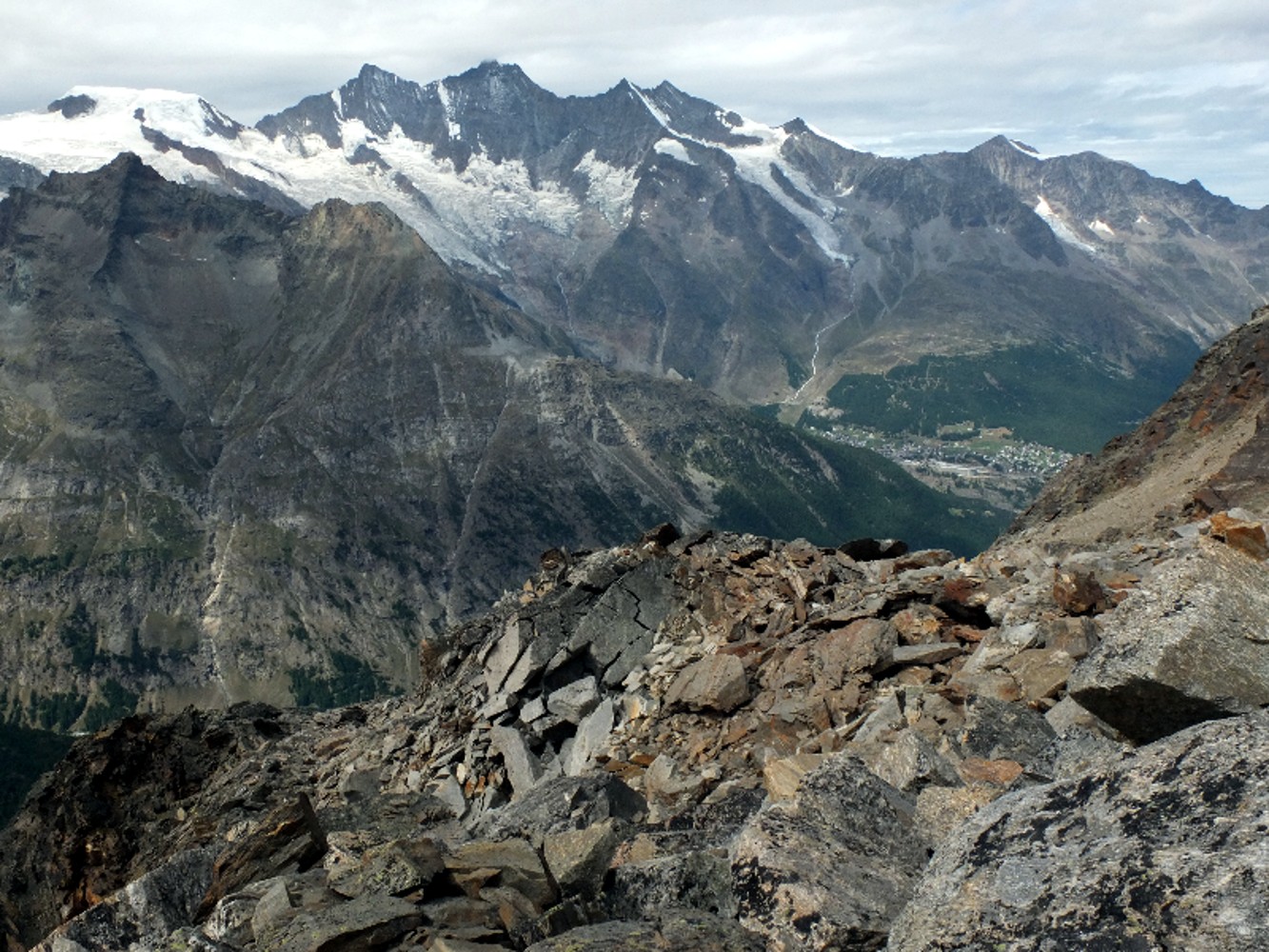 Időközben az ég egyre felhősebb lesz, bár itt még látszanak a szemben lévő négyezresek: az Alphubel, a Taeschorh, Dom, Nadelhorn, Lenspitze...