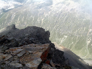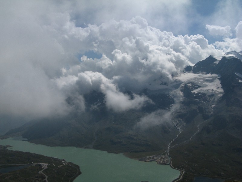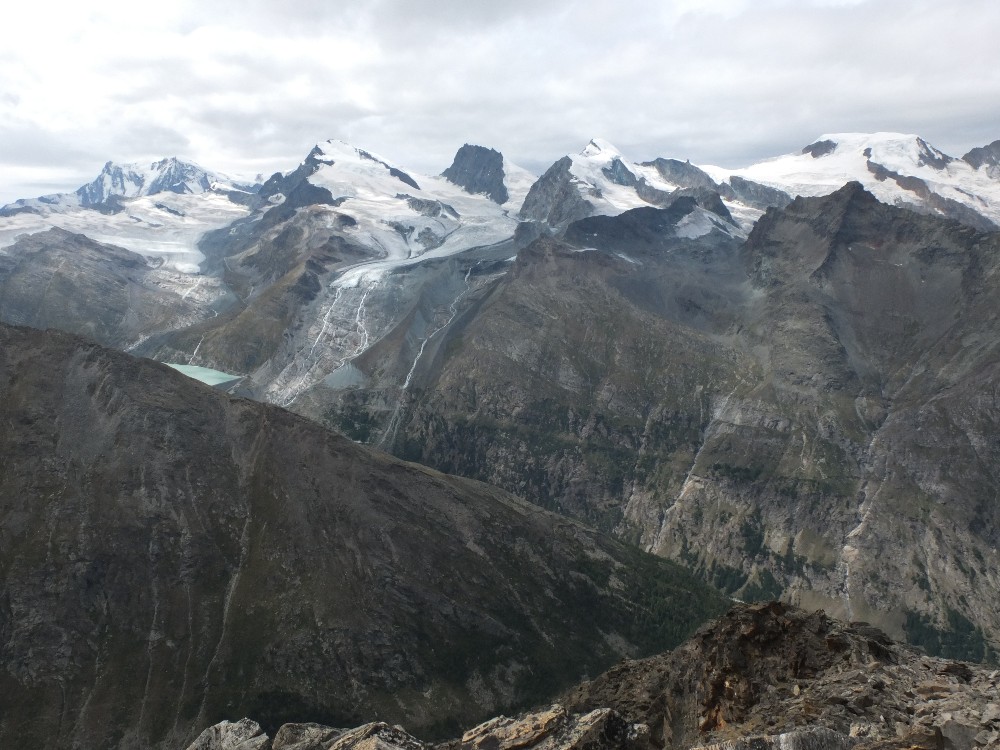 Itt elbúcsúzom a hegytől. Utolsó pillantás ilyen magasságból a Monte Rosa, Strahlhorn, Rimpfischorn, Allalinhorn és Alphubel látványától. Meg az idei nyártól, merthogy ezzel a beálló esővel hó is jön a hétvégére.